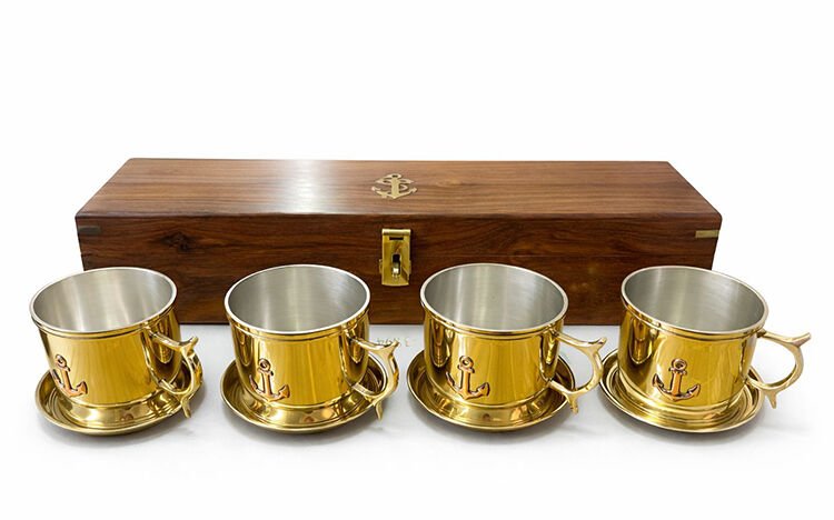38x10 cm Ahşap Kutulu 4'lü Pirinç Fincan Seti, geleneksel sunum sanatını lüks ve nostaljik bir dokunuşla yeniden yorumluyor. Set içerisinde yer alan geniş hacimli 4 adet fincan ve tabağı, pirinç görünümlü kaliteli malzeme ile üretilerek antik bir asalet sunar. Fincanların parlak dış yüzeyi, iç kısımdaki metalik dokuyla birleşerek misafirlerinize kendilerini özel hissettirecek bir servis deneyimi vaat eder. Setin en prestijli parçası olan özel tasarım ahşap kutu, kadife veya sünger destekli iç yapısıyla fincanların güvenle saklanmasını sağlarken, gold kilit mekanizması ve üst kapaktaki şık işlemeleriyle dekoratif bir mücevher kutusu estetiği sergiler. 38 cm genişliğindeki bu büyük boy sunum seti, hem koleksiyon meraklıları hem de marin temalı ev dekorasyonunu sevenler için eşsiz bir parçadır. Dayanıklı yapısı ve zamansız antik tonlarıyla öne çıkan bu pirinç fincan takımı, özel günlerde sunabileceğiniz en görkemli hediyelik eşya seçeneklerinden biridir. Kaliteyi ve geleneksel motifleri bir araya getiren bu set, bulunduğu her ortama zenginlik ve zarafet katar.