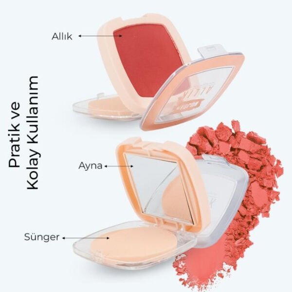 Her bir allığın içerisinde bulunan ayna ve sünger, makyajı dışarıda, seyahatte veya gün içinde tazelemek isteyen kullanıcılar için kullanım kolaylığı sunar. Kompakt yapısı sayesinde çantada taşımaya uygun olan bu set, renk çeşitliliği ve pratik kullanım detaylarıyla makyaj çantasında düzenli ve işlevsel bir alan oluşturur.