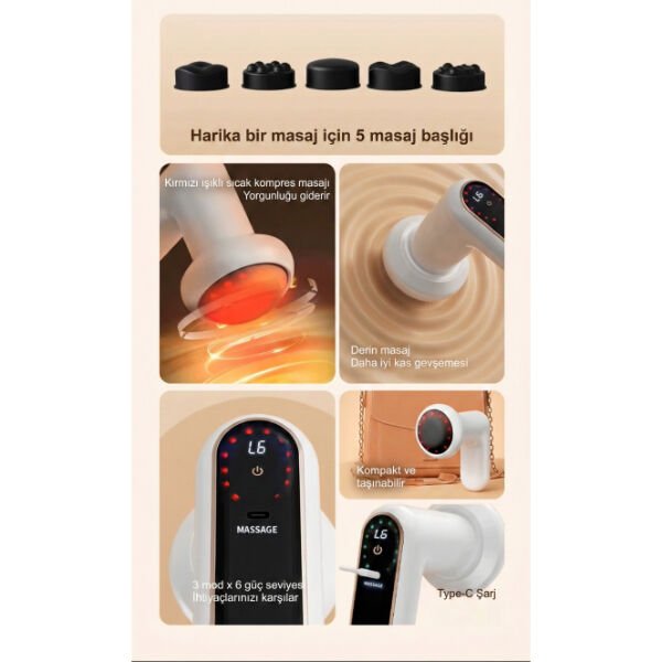 5 başlıklı titreşimli sıkılaştırıcı masaj makinesi, günlük kas yorgunluğunu azaltmaya ve vücudun farklı bölgelerinde rahatlama hissi sağlamaya yardımcı olacak şekilde tasarlanmıştır. Değiştirilebilir 5 farklı masaj başlığı sayesinde boyun, omuz, sırt, bel, bacak ve kalça gibi bölgelerde hedefli kullanım imkânı sunar. Kırmızı ışık destekli sıcak kompres özelliği, masaj sırasında kasların gevşemesine katkı sağlar ve rahatlama etkisini artırır. Güçlü titreşim motoru, ayarlanabilir hız ve şiddet kademeleri ile kişisel ihtiyaca göre masaj deneyimi sunar. Kompakt ve hafif yapısı sayesinde evde, ofiste veya seyahatlerde kolayca kullanılabilir. Type-C şarj özelliği ile pratik bir kullanım sağlar ve kablo karmaşasını ortadan kaldırır. Ergonomik tutuş yapısı, uzun süreli kullanımlarda bile konforlu bir deneyim sunmayı hedefler. Günlük bakım rutininize destek olacak pratik bir masaj çözümüdür.