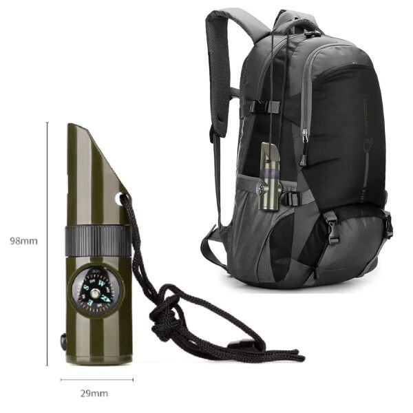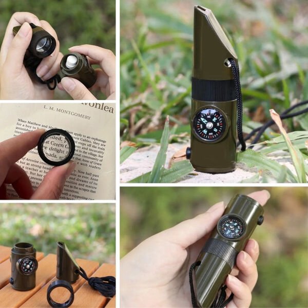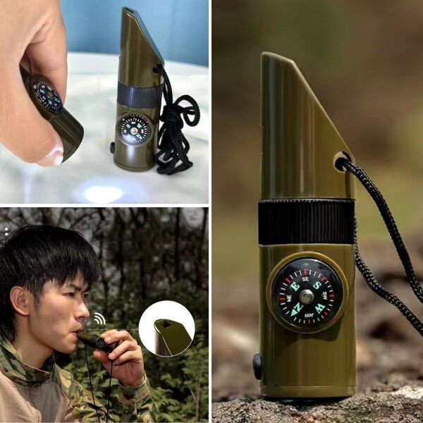 7’si 1 arada acil durum düdüğü, doğa yürüyüşleri, kamp, avcılık ve acil durum senaryoları için çok fonksiyonlu ve pratik bir yardımcı olarak tasarlanmıştır. Entegre el feneri düşük ışık koşullarında ve gece yolculuklarında aydınlatma sağlarken, dahili termometre bulunduğunuz ortamın sıcaklığını anlık olarak takip etmenize yardımcı olur. Hassas pusulası yön bulmayı kolaylaştırarak kaybolma riskini azaltır. Büyüteç özelliği küçük detayları net şekilde görmenizi sağlarken, gövde içinde yer alan depolama bölmesi kibrit, iğne veya küçük acil durum malzemeleri için saklama alanı sunar. Güçlü düdük bölümü acil durumlarda yüksek sesle sinyal vererek çevredeki dikkatleri üzerinize çeker. Kompakt, hafif ve dayanıklı yapısı sayesinde çantada, boyunda veya cebinizde rahatlıkla taşınabilir. Kamp, trekking, dağcılık, izcilik ve günlük outdoor aktivitelerinde güvenlik ve pratikliği bir arada sunar.
