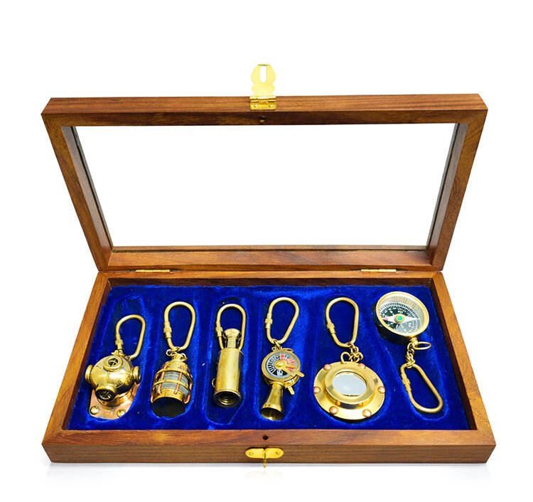Ahşap Kutulu Denizci Temalı Pirinç Anahtarlık Seti