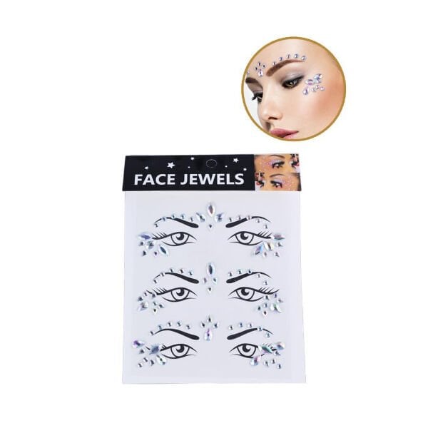 Gümüş taşlı makyaj yüz süsü, “Face Jewels” tasarımı ile hazırlanan dekoratif bir makyaj aksesuarıdır. Ürün, göz çevresi ve kaş üstü bölgesine uygun şekilde konumlandırılmış çoklu taş dizilimlerinden oluşur. Parlak yüzeyli gümüş taş detayları ışığı yansıtan bir görünüm sunar ve yüz makyajında dikkat çekici bir etki oluşturur. Simetrik formda hazırlanan taş yerleşimi, her iki göz çevresinde dengeli bir görünüm sağlar. Farklı boyutlardaki taş kombinasyonu sayesinde tek parça halinde bütüncül bir tasarım sunar. Özel gün makyajlarında, festival stilinde veya sahne makyajında kullanılabilecek Face Jewels yüz süsü, makyaja ışıltılı ve belirgin bir dokunuş kazandırır.
