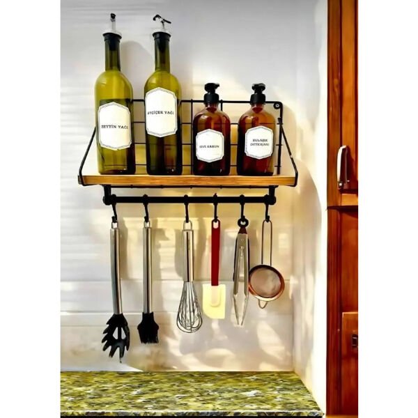 Metal askılıklı kahve köşesi rafı, mutfağınızda düzeni ve şıklığı bir arada sunar. Üst kısmı ahşap raf, alt kısmı ise metal boru üzerine yerleştirilmiş 6 adet sağlam askılıktan oluşur. Duvara monte edilebilen bu dekoratif düzenleyici, kahve fincanlarınızı, küçük tabakları, kavanozları ve mutfak aksesuarlarını estetik bir biçimde sergilemenize olanak tanır. Mutfak tezgâh üstü alanlarda veya kahve köşelerinde fonksiyonel ve modern bir görünüm yaratır. Metal iskeleti sayesinde uzun ömürlü kullanım sağlar. Az yer kaplayan tasarımı ile dar alanlarda bile pratik çözümler sunar.Ürün ölçüleri; uzunluk 42 cm, genişlik 13 cm, yükseklik 20 cm'dir.