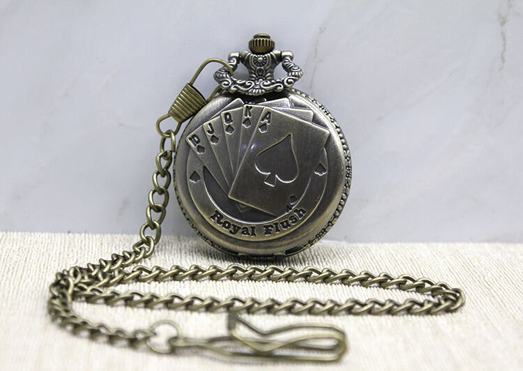 Oyun Kartı Tasarımlı Köstekli Saat, klasik cep saati formunu dikkat çekici oyun kartı detaylarıyla birleştiren şık bir aksesuardır. 4x5 cm ölçüsündeki kompakt yapısı sayesinde cepte kolay taşınabilir ve zincirli tasarımı ile hem kullanışlı hem dekoratif bir görünüm sunar. Kapak kısmında yer alan oyun kartı temalı tasarım detayı ürüne estetik bir karakter kazandırır. Zincirli yapısı sayesinde köstekli cep saati olarak klasik bir stil tamamlayıcısıdır. Günlük kullanımın yanı sıra koleksiyon ve dekoratif amaçlı da tercih edilebilecek şık bir nostaljik saat modeli alternatifidir.