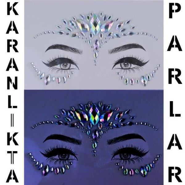 Pembe taşlı makyaj yüz süsü, göz çevresi ve yüz hatlarına ışıltılı bir dokunuş katmak isteyenler için tasarlanmış dekoratif bir makyaj aksesuarıdır. Farklı boyutlardaki pembe taş detayları sayesinde yüz makyajına dikkat çekici ve parlak bir görünüm kazandırır. Göz üstü, kaş altı ve elmacık kemiği çevresine uygulanabilen tasarımı ile festival, parti ve özel organizasyon makyajlarında etkileyici bir stil oluşturur. Taşlı yüz süsü formu ile klasik makyajı daha gösterişli hale getirirken, simetrik dizilimi sayesinde kolay uygulama imkânı sunar. Cilt üzerinde belirgin ve estetik bir görünüm sağlayan pembe yüz taşı, sahne makyajı ve konsept çekimlerde de tercih edilebilir. Makyaj yüz süsü tasarımı sayesinde tek başına kullanılabildiği gibi farklı makyaj stilleriyle kombinlenerek özgün ve dikkat çekici görünümler oluşturulabilir.