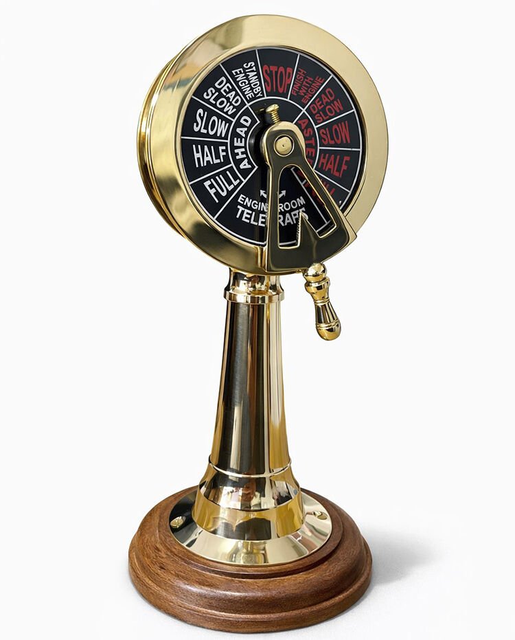 Pirinç Makina Telgrafı, denizcilik tarihinin en ikonik iletişim araçlarından birini ev ve ofis dekorasyonunuza taşıyan, el işçiliği detaylarıyla zenginleştirilmiş prestijli bir aksesuardır. 23x9 cm boyutlarındaki bu özel tasarım, gemi kaptan köşkünden makine dairesine komut göndermek için kullanılan orijinal telgrafların estetik bir minyatür formudur. Pirinç görünümlü kaliteli malzeme kullanılarak üretilen gövdesi, antik gold ışıltısıyla bulunduğu ortama nostaljik ve asil bir hava katar. Ürünün altında yer alan dairesel ahşap stand, parlak metalik yüzey ile doğal dokunun kusursuz uyumunu sunarken ürünün dengeli ve şık bir şekilde sergilenmesini sağlar. Kadran üzerindeki net komut yazıları ve hareketli kol mekanizması, ürünün otantik karakterini güçlendirerek gerçekçi bir deneyim sunar. Bu dekoratif makine telgrafı, marin temalı mekanlar, çalışma odaları veya kütüphaneler için eşsiz bir tamamlayıcıdır. Hem deniz tutkunları hem de antika meraklıları için unutulmaz bir hediyelik eşya seçeneği olan bu biblo, geleneksel denizcilik estetiğini kaliteli işçilikle birleştirir. Bulunduğu her ortamda dikkat çekici bir odak noktası oluşturan bu pirinç dekor objesi, kaliteden ödün vermeyenler için tasarlanmıştır.