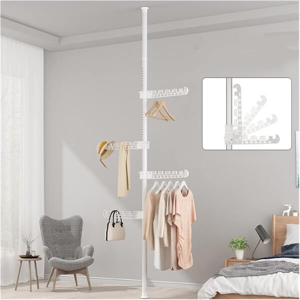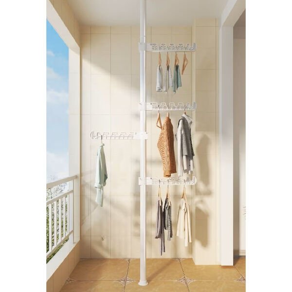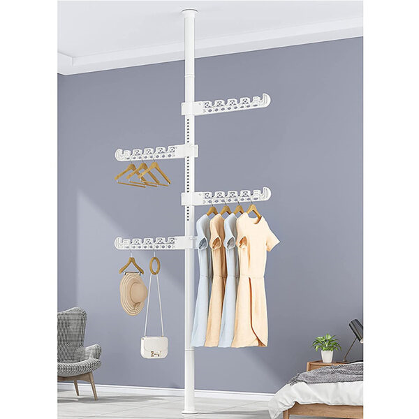 Teleskopik Giysi ve Çamaşır Askısı, dar alanlarda maksimum verim almak ve kıyafetlerinizi düzenlemek için tasarlanmış yenilikçi bir depolama çözümüdür. Matkap veya vida gerektirmeyen, tavan ve taban arasına sıkıştırma yöntemiyle kurulan teleskopik direk mekanizması sayesinde evinizin her köşesini saniyeler içinde şık bir gardıroba dönüştürebilirsiniz. Ürün, üzerinde 360 derece dönebilen ve yüksekliği ayarlanabilen çok fonksiyonlu askı kollarından oluşur. Her bir askı kolu, 90 derece katlanabilir özelliği sayesinde kullanımda değilken yukarı doğru kapatılarak alan tasarrufu sağlar. Dayanıklı metal gövdesi ve yüksek taşıma kapasiteli özel askı yuvaları, kıyafetlerin birbirine karışmasını engellerken düzenli bir görünüm sunar. Sadece giysiler için değil; çanta, şapka ve aksesuarlar için de ideal bir askı alanıdır. Balkonlarda çamaşır kurutmak, yatak odalarında açık gardırop sistemi kurmak veya antrelerde vestiyer olarak kullanmak için mükemmeldir. Modern beyaz tasarımıyla her türlü iç mekan dekorasyonuna uyum sağlayan bu portatif askılık, taşınabilir yapısıyla kiracılar ve yer sıkıntısı çekenler için en pratik çözümdür.